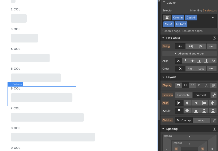 All you need to do is set up a "Column" class, then set up the different sizes for on desktop, tablet, and mobile. It's best to build on a 12 Column layout, as this is the structure that is currently most commonly used throughout the web, and most website designs are initially built on a 12 column layout.